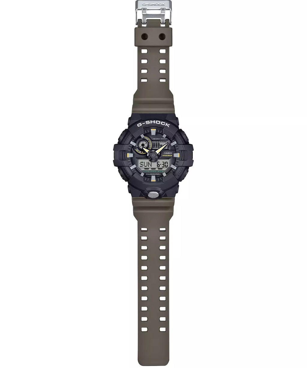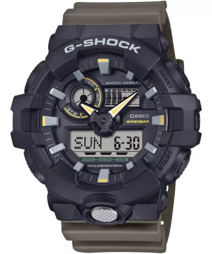 A Casio G-SHOCK Original GA-710TU-1A3ER egy praktikus modell az igényes viselők számára. Mind a zöld szíj, mind a fekete tok erős műanyagból készült. Világidő, szundi, némítás, 5 napi ébresztő, kibővített naptár, stopperóra, időzítő és Super Illuminator mind olyan funkciók, amelyeket a kijelzőn keresztül tudunk működtetni. A képernyő védelméről ásványi üveg gondoskodik. Az óra rezgés- és ütésálló. A vízállósága 200 méter.