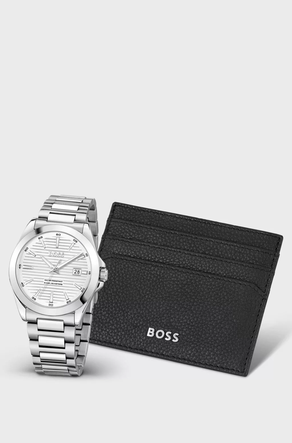 Ez a BOSS Menswear kiegészítő készlet ideális ajándék egy kifinomult ízlésű ember számára. Tartalmaz egy bőr kártyatartót és acél órát, hornyolt számlappal.