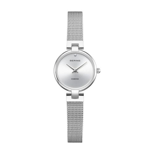A BERING Classic Diamond 17724-000 női karóra időtlen eleganciát hoz minden pillanatba. A dizájnja egyszerre letisztult és kifinomult: fehér számlapja ezüstszínű nemesacél tokkal és mesh (milánói) szíjjal párosul, aminek csúszócsatos biztonsági zárja garantálja, hogy viselése stabil és kényelmes legyen. A tok átmérője mindössze 24 mm, így kifejezetten finomnak számít, ideális választás karcsúbb csuklóra, de még ott sem veszik el, ha valaki inkább visszafogott stílust keres.