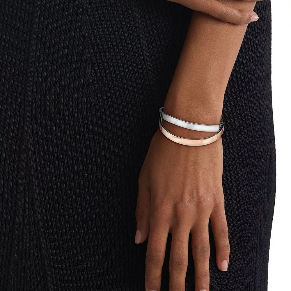 A karperec tartós nemesacélból készült, elegáns ezüst és rózsaarany tónusban, ami egyszerre ad klasszikus és trendi hatást. A tartós, merev bangle forma egyszerűen a csuklóra csúsztatható — nincs bonyolult csat vagy zár — mégis stabilan a helyén marad.