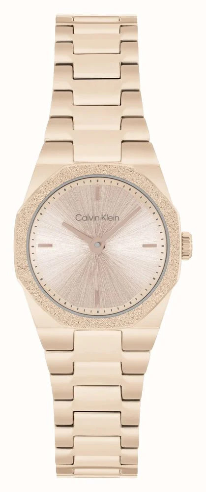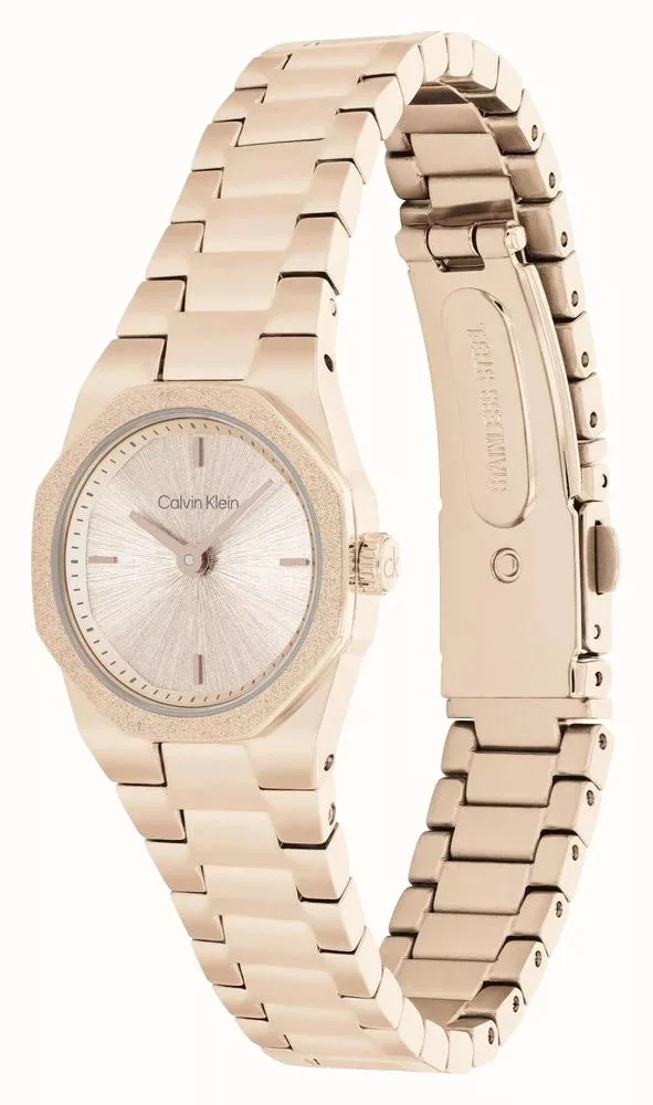 A Calvin Klein 25100144 Geometric Elegance női karóra a márka minimalista filozófiájának egyik letisztult remekműve, amely a modern eleganciát és a mindennapi praktikusságot egyaránt képviseli. A 23 mm átmérőjű rozéarany tok finoman ültetett jelleget ad a csuklón, miközben a finoman strukturált számlap azonnal megragadja a tekintetet. A letisztult analóg kijelzés klasszikus megjelenést kínál, amely minden outfithez remekül illik, legyen szó hétköznapi viseletről vagy elegáns eseményről.