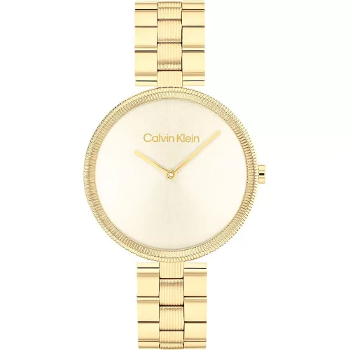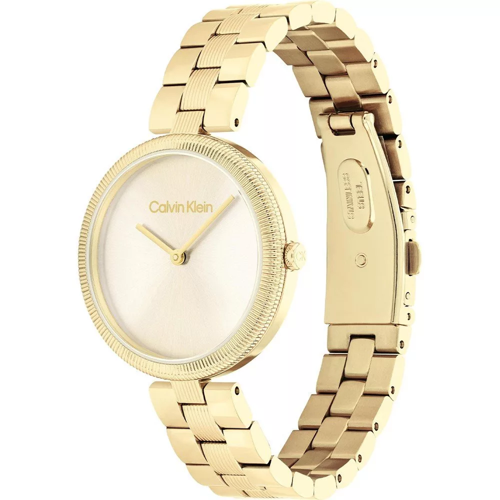 Ez a Calvin Klein óra rozsdamentes acélból készült, 32 mm átmérőjű tokkal és fém szíjjal van felszerelve. A tok belsejében egy Seiko Instruments Inc. szerkezet található, az órán pedig ásványi kristály található.