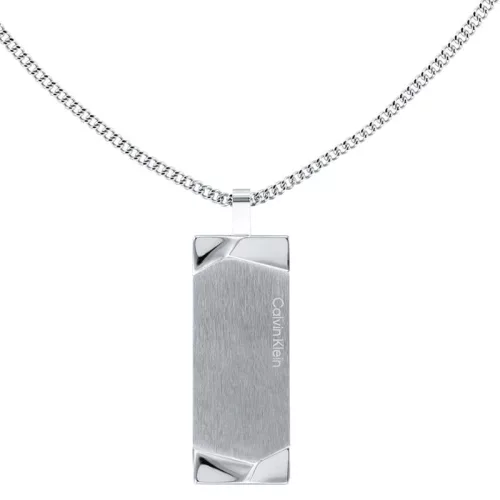 Modern nyaklánc a Calvin Klein márkától, kiváló minőségű sebészeti acélból készült, a nyaklánc meghatározó eleme a szálcsiszolt medál, dögcédula kivitelezéssel, a medált márkafelirat és finom csíkok díszítik, a nyaklánc hossza: 60 cm, klasszikus karabiner kapoccsal, hagyja magát elvarázsolni az egyedi ékszerekkel.