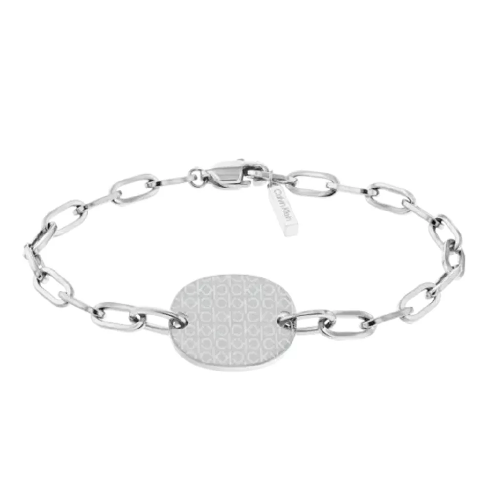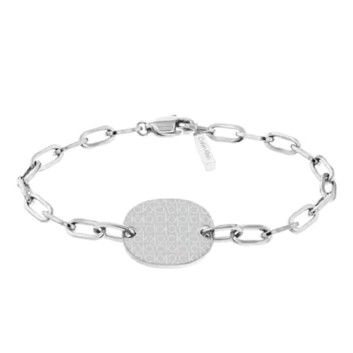 Calvin Klein női karkötő típusa 35000396.  Gyengéd női karkötő a Calvin Klein márka műhelyéből, minőségi sebészeti acélból készült,  dísszel, amely a teljes felületén a márka kezdőbetűivel díszített, klasszikus karabiner kapoccsal, a karkötő hossza: 15,5 cm, egy karkötő, amely első pillantásra felkelti a figyelmet.