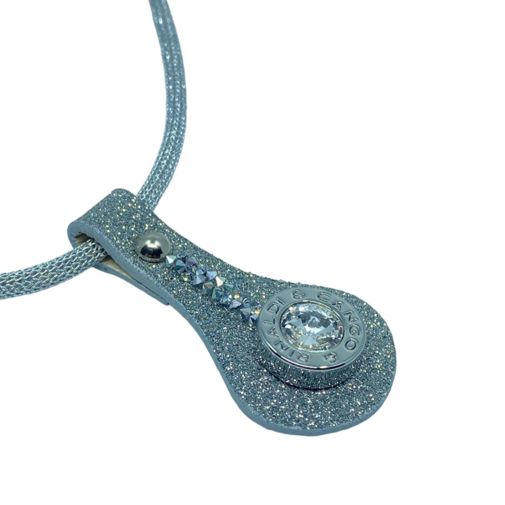 B13NY cikkszámmal ellátott nyaklánc ezüst színű, minőségi olasz bőr és ezüst színű huzal kombinációjából, mágneses hengerzáras záródással, a bőr medálon ezüst színű fém foglalattal, benne egy nagyobb méretű, különleges csiszolású, fehér színű kristállyal  színű, szórt köves díszítéssel. A fémkellékbe gravírozott Cango&Rinaldi márkafelirat jelöli a brand eredetiségét és minőségét! Nyaklánc méretei: teljes hossz: 450 mm (egy méretben kapcsolható)