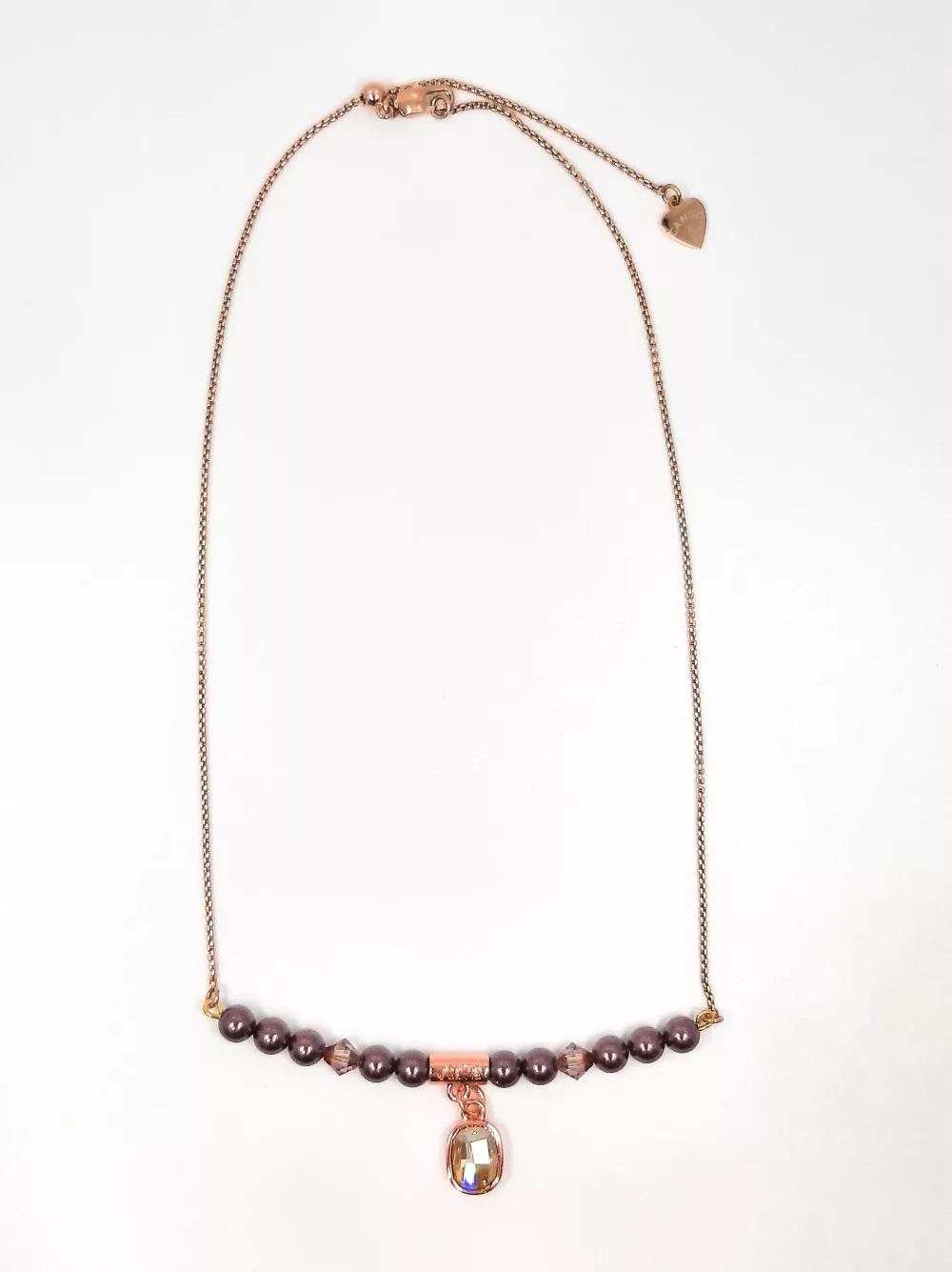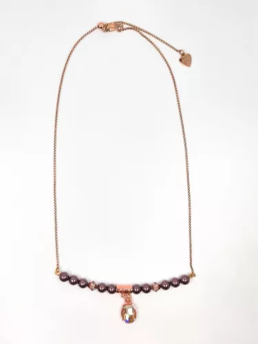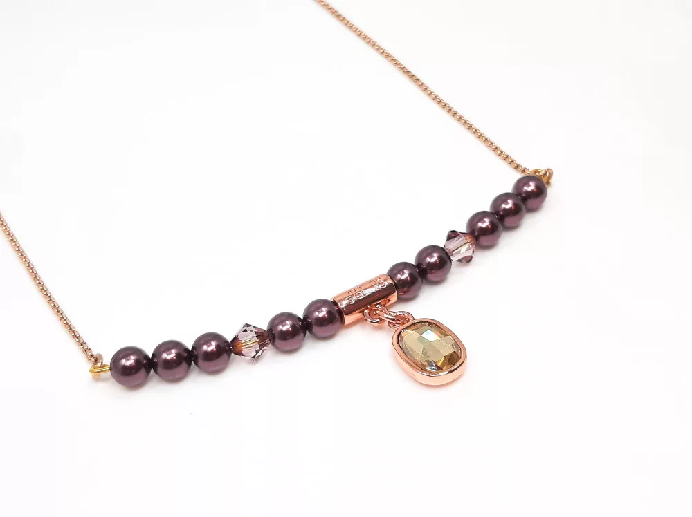 Cango&Rinaldi női nyaklánc típusa 56739-2204NY. Cango&Rinaldi gyöngy nyaklánc modell a Pearl kollekcióból. Lilaszínű gyöngy, rozgold színű lánc és arany kristályok kombinációjából készült egy soros Cango&Rinaldi nyaklánc. A nyakláncon márkajelzett rosegold színű fém foglalatban különleges csiszolású és formájú arany színű kristállyal díszített, illetve rosegoldszínű charm-al díszítve, melyen Cango&R gravírozás jelöli a brand eredetiséget és minőséget. A nyaklánc fém zárral 500 mm-ig bármilyen méretben állítható. Fedezze fel a gyöngyök varázslatos világát a Cango&Rinaldi legújabb ékszerkollekciójában! A gyöngyök olyan egyedülálló bevonattal rendelkeznek, amely a legmagasabb ellenállást tanusítja külső behatásokkal szemben (tengeri levegő, UV sugárzás, perfüm permet, karcolás, hőmérséklet ingadozások). Az elérhető színpaletta és a gyöngyök súlya szinte teljesen megegyezik az igazgyöngyök tulajdonságaival. Viselése során felveszi a test hőmérsékletét, ez által hosszú távon is kényelmes a bőrnek.