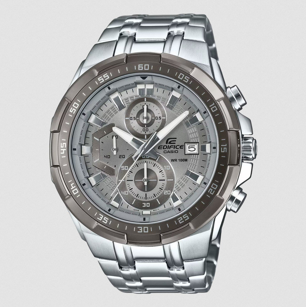 A képen látható Edifice by Casio márkájú EFR-539DE-8AVUEF típus számú Sportos Férfi karóra tok anyaga Nemesacél/Aluminium, a szíja Nemesacél-ból készült. A karóra üvege Kristály, vízállósága 100m és az óratok mérete 50 mm. Az óra Quartz szerkezetű.