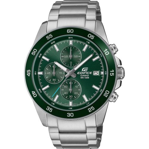 A Casio EDIFICE Classic Chronograph EFR-526D-3AVUEF egy olyan óra, amely egyesíti a dinamizmust és a klasszikus eleganciát. A megbízható Casio 5345 japán kvarcszerkezettel felszerelt modell pontosságot és tartósságot biztosít. Az ezüst karkötő és a zöld káva egyedi megjelenést kölcsönöz az órának, míg az olyan funkciók, mint a kronográf és a napi időzítő nem csak stílusossá, de rendkívül praktikus kiegészítővé is teszik. A Neobrite technológia minden körülmények között garantálja a kiváló olvashatóságot, az akár 10 atm vízállóság pedig ideális választássá teszi az órát az aktív férfiak számára, akik nem félnek a kihívásoktól.