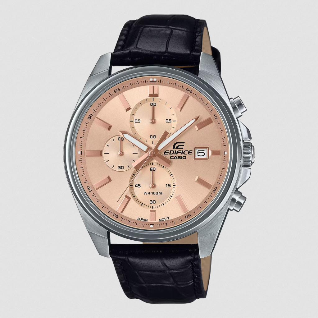 A képen látható Edifice Casio márkájú EFV-610EL-5AUEF típus számú Divatos Férfi Karóra tok anyaga Nemesacél, a szíja Valódi bőr-ből készült. A karóra üvege Kristály, vízállósága 100m és az óratok mérete 44 mm. Ez az edifice karóra Quartz szerkezetű.