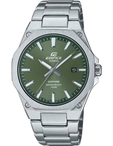 EDIFICE SLIM sorozat zafírkristállyal | Ez a háromkezes analóg modell vékony, 7,8 mm vastag tokkal rendelkezik, amely javítja az illeszkedést. Az óra lapos, nyolcszögletű előlappal rendelkezik, hajszálvonallal, amely sportos, de fényűző dizájnt kölcsönöz. A hajszálvonallal ellátott számlap is kiváló minőségű érzetet kelt.