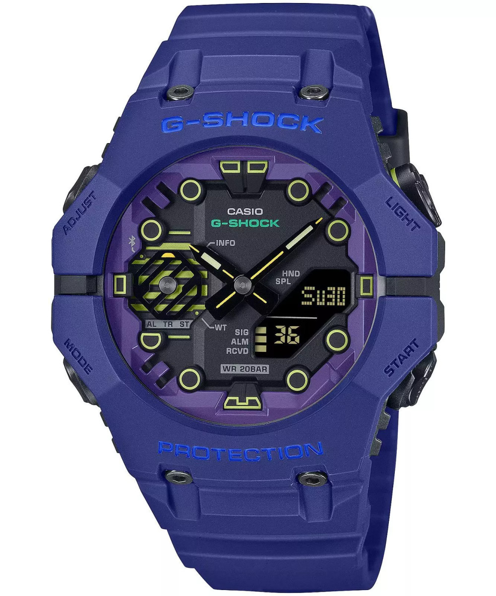 A Casio G-SHOCK Original GA-B001 Series Bluetooth GA-B001CBR-2AER egy sportos és strapabíró óra kvarc mechanikus verccsel, élettartama 5 év. A lila és sárga elemekkel díszített szénerősítésű boríték gyantából készült, melyhez lila gumipánt van rögzítve. Az olyan funkciókon kívül, mint az 5 napi riasztás, a Bluetooth Smart és a világidő funkció, ez a modell sok más hasznos opcióval is rendelkezik. Ütésálló, időzítővel, automatikus naptárral és az elveszett telefon megtalálásának lehetőségével rendelkezik. Az óra 20 ATM mélységig vízálló.