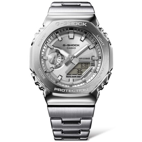 Bemutatjuk a GM-2110D-t – a GA-2100-on alapuló G-STEEL analóg-digitális kombinációt, most stílusos fém kerettel és szalagfrissítéssel. Az aprólékosan kovácsolt és polírozott, egységes nyolcszögletű rozsdamentes acél keret egyszerű, zökkenőmentes dizájnt rögzít kifinomult, mégis kemény megjelenéssel. A nagy szilárdságú, üvegszál erősítésű finom gyantából készült tok a legvékonyabb az összes G-SHOCK kombinációs modell közül, mindössze 11,8 mm-rel. A fémszíj a fémes sárgaréz számlap friss színeivel együtt bármire alkalmas – munkára vagy játékra. Válasszon az égkék, narancssárga vagy lime zöld közül, a sötétkék és az ezüst klasszikus árnyalatai mellett. Mindegyik nagy fényerejű dupla LED-es világítással, amely még sötétben is könnyű leolvasást biztosít.