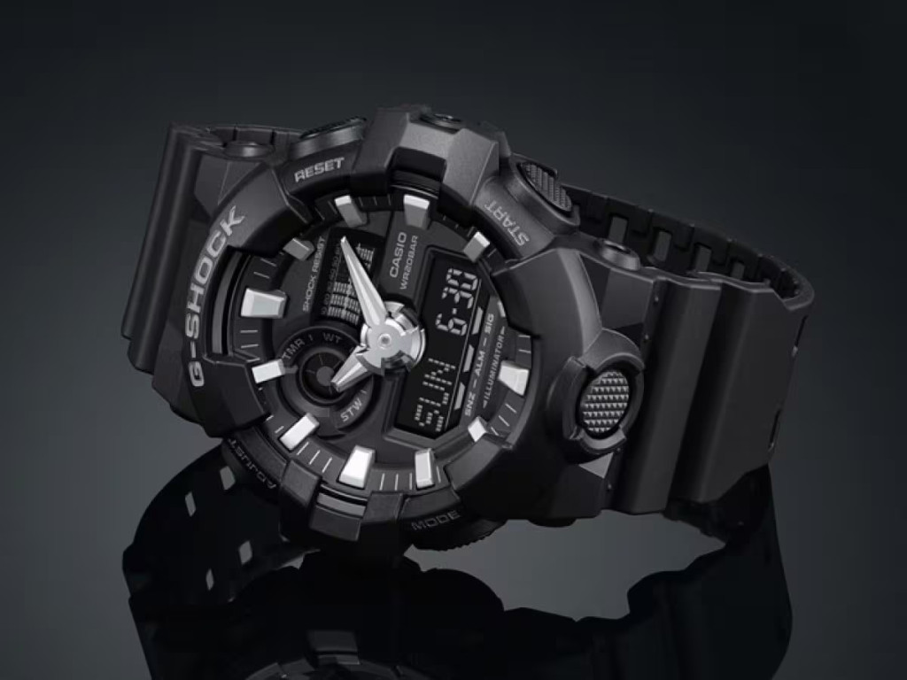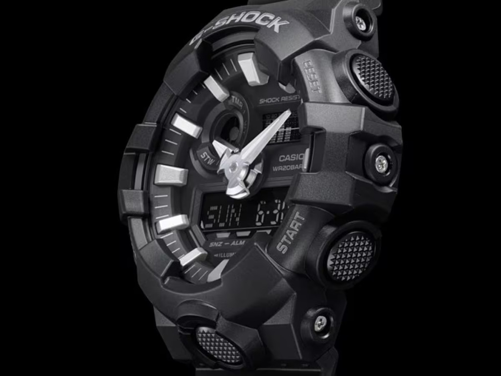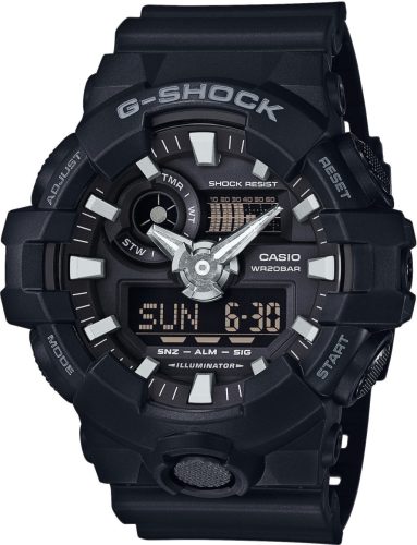 A Casio G-Shock GA-700-1B egy férfi analóg–digitális karóra, amely a G-SHOCK sorozat legendás ütés- és vízállóságát kombinálja markáns, fekete dizájnnal. A 53,4 × 57,5 × 18,4 mm-es műanyag tok és a hozzá illő műanyag szíj masszív, ugyanakkor viselhető méretet biztosít, a 70 grammos súly pedig egész nap kényelmes viseletet garantál.