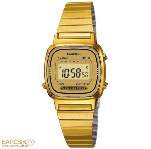 A Casio Collection női karóra LA670WEGA-9EF karóra házának anyaga Műanyag, színe Arany, a szíjának anyaga Nemesacél és a színe Arany. Az óratok átmérője 25 mm, alakja Szögletes. A karóra üvege Kristály (nehezen karcolható), szerkezete Kvarc és vízállósága 3 atm (30m) (cseppmentes).
