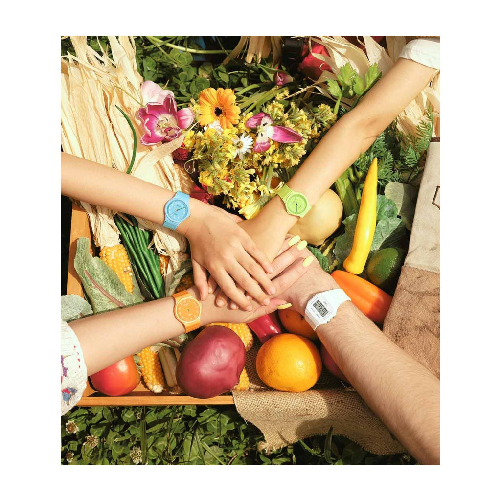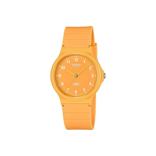 Egy narancssárga, időtlen analóg óra, óra, perc és másodpercmutatókkal. Minimalista megjelenés, vízállóság és környezetbarát bioalapú gyanta bevonat ebben a retró univerzális gépben.