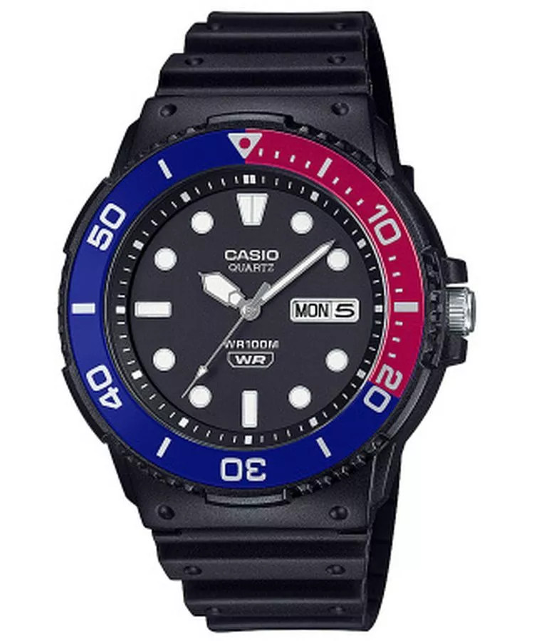 A Casio Sport MRW-230H-1E2VEF férfi karóra tökéletes választás azoknak az aktív férfiaknak, akik értékelik a funkcionalitást és a modern dizájnt. Többszínű műanyag burkolata 45 mm széles, ami robusztus megjelenést kölcsönöz neki. Az óra fekete számlapját hessalit üveg borítja, amely az óra védelméért felel. Az óra kvarcművel van felszerelve. A fekete színű gumiszíj kényelmes viselet, és tökéletesen harmonizál az általános dizájnnal. Az óra 100 m vízállósági besorolással rendelkezik, így fröccsenésálló, és úszás közben is viselhető. Ezenkívül az óra Neobrite funkcióval rendelkezik, amely láthatóságot biztosít a sötétben. Praktikus és stílusos választás minden férfi számára.