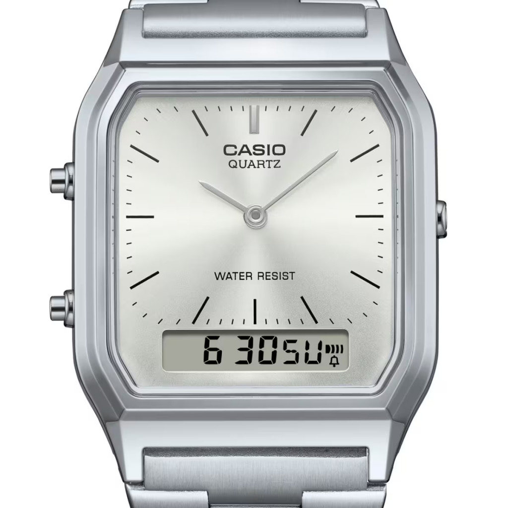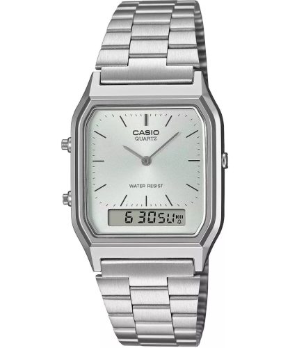 A Casio Vintage AQ-230A-7AMQYES egy unisex karóra, amely ezüst színű nemesacél szíjjal és tokkal, valamint kombinált analóg-digitális kijelzővel rendelkezik. Stílusában a 80-as évek nosztalgikus hangulatát idézi, de modern funkciókat kínál a mai felhasználóknak. A karóra kettős időzóna kezelésére is képes, így ideális választás utazóknak. Az időt a hagyományos mutatók és a digitális kijelzőn keresztül is megjeleníti, ahol a másodpercet, a napot és a dátumot is láthatod. A japán kvarcszerkezet megbízható és pontos időmérést biztosít, és a benne lévő elem akár 3 évig is működőképes lehet. A cseppálló kialakítás megvédi az órát a mindennapi fröccsenésektől, de merüléshez nem ajánlott. A 38,8 x 29,8 x 8,1 mm-es mérete és a 47 grammos súlya miatt rendkívül könnyű és kényelmes viseletet biztosít a mindennapokban. A termék eleganciája és vintage stílusa miatt a hétköznapi és elegánsabb öltözékekhez egyaránt remekül illeszkedik. Eredeti gyári dobozban szállítjuk, így ajándéknak is kiválló választás.