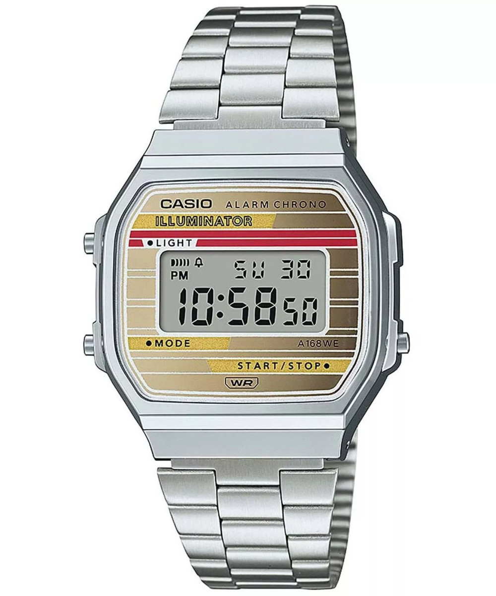 A Casio VINTAGE Iconic A168WEHA-9AEF férfi karóra japán kvarcszerkezettel működik, 7 éves akkumulátor-élettartammal. Az ezüst műanyag borítékhoz rozsdamentes acél karkötő párosul. A modell olyan funkciókkal van felszerelve, mint a napi riasztás, a megvilágító, a naptár és a stopper. A sárga és piros elemekkel díszített kijelzőt és számlapot hessalit üveg védi a sérülésektől.