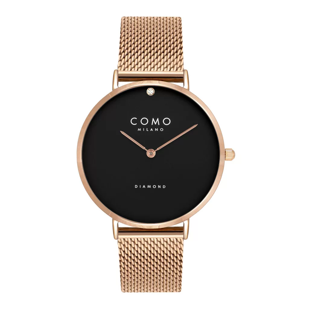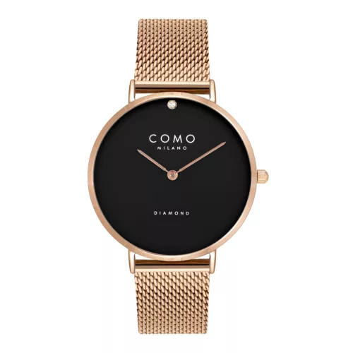 Kerek formájú, rosegold színű nemesacél óratokkal, fekete analóg számlappal és rosegold nemesacél szíjjal rendelkező divatos Como Milano karóra. Az óra elemmel működő kvarc szerkezettel és 3 ATM vízállósággal rendelkezik, tehát cseppálló. Üvege: ásványi üveg. Szíj széllesége: 16 mm