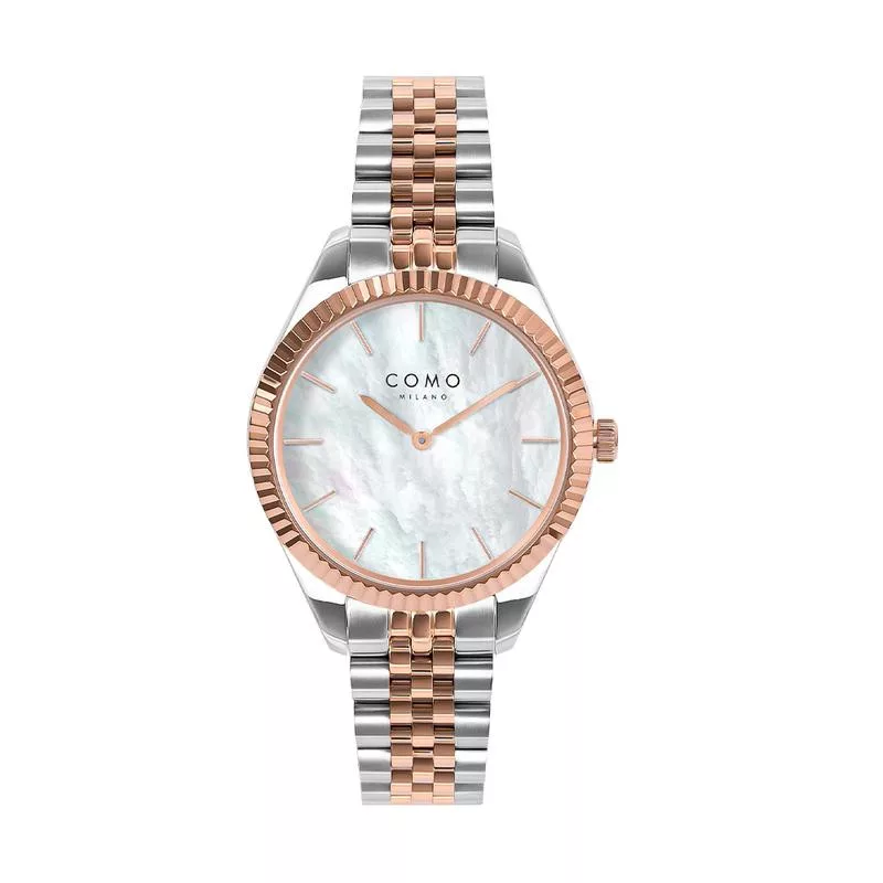 Kerek formájú, rosegold,ezüst színű nemesacél óratokkal, gyöngyház fehér analóg számlappal és ezüst, rosegold nemesacél szíjjal rendelkező divatos Como Milano karóra. Az óra elemmel működő kvarc szerkezettel és 3 ATM vízállósággal rendelkezik, tehát cseppálló. Üvege: ásványi üveg. Szíj széllesége: 18 mm
