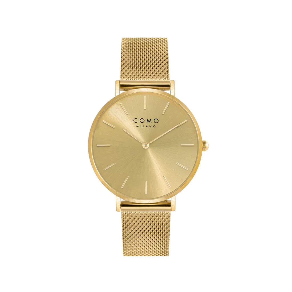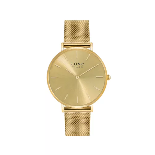 Kerek formájú, arany színű nemesacél óratokkal, arany analóg számlappal és arany nemesacél szíjjal rendelkező divatos Como Milano karóra. Az óra elemmel működő kvarc szerkezettel és 3 ATM vízállósággal rendelkezik, tehát cseppálló. Üvege: ásványi üveg. Szíj széllesége: 16 mm