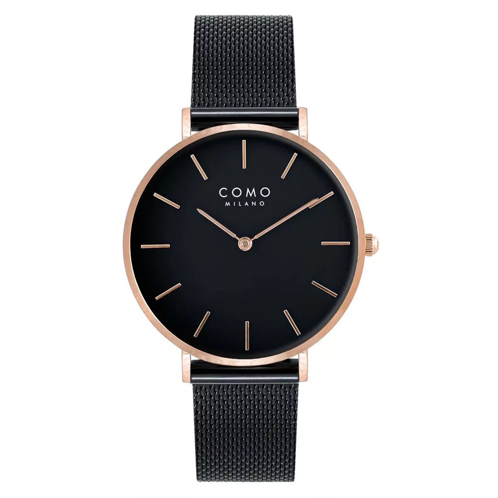 Kerek formájú, rosegold színű nemesacél óratokkal, fekete analóg számlappal és fekete nemesacél szíjjal rendelkező divatos Como Milano karóra. Az óra elemmel működő kvarc szerkezettel és 3 ATM vízállósággal rendelkezik, tehát cseppálló. Üvege: ásványi üveg. Szíj széllesége: 16 mm