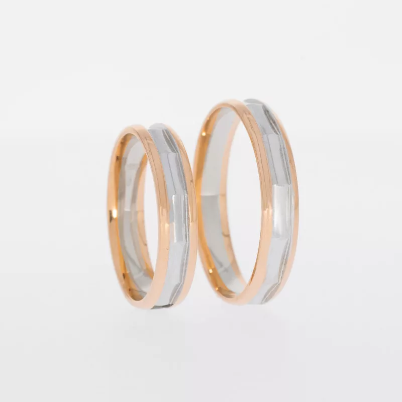 Fehér-rozé arany karikagyűrű 4316RFR. 14 karátos fehérarany fényes,a két szélén rosé arany metszett felületű karikagyűrűk. Kívül tagolt-domború,belül enyhén domborított profilú,szélessége: 4mm. Kő nélküli fazon.Súlya mérettől függően változik. Jegygyűrű,mely az örökké tartó, véget nem érő szövetség jelképe. A jegygyűrű már nagyon régről szimbóluma a férfi és nő között szövetségnek.A férfi két gyűrűt ad a menyasszonynak és egyet vesz magának is, amit a házasságban is viselni fog.