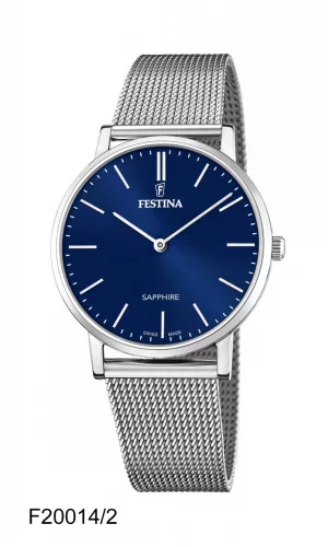 Festina F20014/2 férfi karóra rozsdamentes acél tokkal és zafír üveggel, rozsdamentes acél karkötővel. A kvarc szerkezet megbízható működést biztosít, míg az 50 méteres (5 ATM) vízállóság lehetővé teszi a mindennapi használatot, például kézmosást vagy esőben való viselést. A Festina órák az elegancia és a funkcionalitás tökéletes keveréke. A Festina előkelő dizájnt, folyamatos technológiai innovációt és kiváló ár-érték arányt kínál. A Swiss Made címke az óragyártás kiválóságát képviseli. Az új Swiss Made kollekció az időmérők exkluzív választékát kínálja, ahol a svájci óragyártási know-how találkozik a FESTINA márka egyedi stílusával, a legtisztességesebb áron.