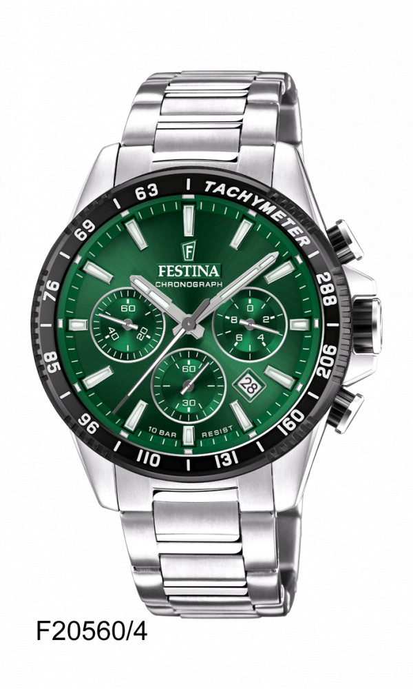 Az F20560/4 a Festina Timeless Chronograph kollekciójába tartozik ami vagány zöld számlappal és sportos, PVD bevonatos fix lünettával készült. A Festina Timeless Chrono ahogy a nevéből is már sejthető egy stopperes karóra. A számlap mögött japán elemes szerkezet ketyeg, egy Miyota FS26-os kaliber. A stopper maximális mérési intervalluma 60 perc. A tok jobb oldalán található felső gombbal lehet elindítani és megállítani, majd az alsó gombbal állítható vissza az alaphelyzetbe. A számlap központi tengelyén az óra és percmutatók, valamint a stopper másodpercmutatója kapott helyet. A jobb oldali segédkör a stopper tizedmásodperc mérője, a bal oldali kör a stopper percgyűjtője, míg az alsó körön az óra hagyományos másodperc mutatója található. A 4-es és 5-ös indexek között olvasható ki a pontos dátum, amit a korona félig kihúzott állapotában tudunk beállítani. A fiatalos és különleges sötétzöld számlapot felülről kristály üveg védi az esetleges sérülésektől, amit egy feketített Tachymeter skála koronáz meg.