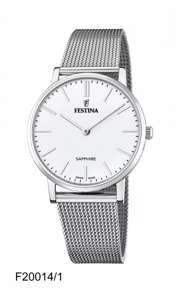 Festina Swiss Made férfi karóra típusa F20014-1. Festina F20014/1 férfi karóra rozsdamentes acél tokkal és zafír üveggel, rozsdamentes acél karkötővel. A Festina órák az elegancia és a funkcionalitás tökéletes keveréke. A Festina előkelő dizájnt, folyamatos technológiai innovációt és kiváló ár-érték arányt kínál.  A Swiss Made címke az óragyártás kiválóságát képviseli. Az új Swiss Made kollekció az időmérők exkluzív választékát kínálja ... ahol a svájci óragyártási know-how találkozik a FESTINA márka egyedi stílusával ... a legtisztességesebb áron.