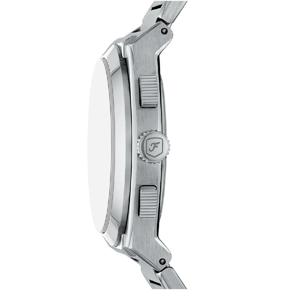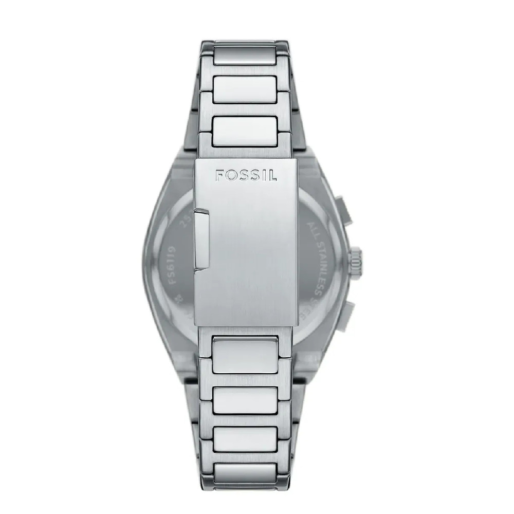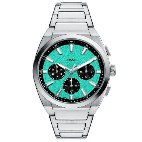 A FOSSIL EVERETT CHRONOGRAPH FS6117 karóra 5 BAR nyomásig alapszinten vízálló, ezüstszínű nemesacél tokkal, edzett kristályüveggel, ezüstszínű acélcsattal, nyitáskönnyített csatközéppel készül. Az órát pontos quartz óraszerkezet működteti, mely elemmel működik. 1/1 másodperces mérési egységű stoppert használhat maximum 30 perc mérési idővel.