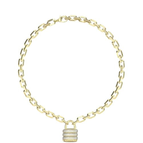 Ez a lenyűgöző Guess női nyaklánc (cikkszám: JUBN05415JWYGT/U) a modern elegancia és a merész stílus tökéletes ötvözete. Az ékszer kiváló minőségű, tartós rozsdamentes acélból készült, amelyet ragyogó arany PVD bevonattal láttak el a hosszan tartó csillogás érdekében. A nyaklánc fő díszítőeleme egy bájos, lakattal kombinált logóval ellátott medál, amelyet apró, fénylő kristályok tesznek még exkluzívabbá. A kiegészítő hossza praktikusan állítható (általában 40 és 45 cm között), így viselője könnyedén a saját stílusához és dekoltázsához igazíthatja. A biztonságos és kényelmes viseletet a klasszikus homárkapocs (delfinkapocs) garantálja. Ez a Guess ékszer ideális választás mindennapi viseletre, de különleges alkalmakra is remekül megállja a helyét, egy csipetnyi luxust csempészve bármilyen összeállításba.