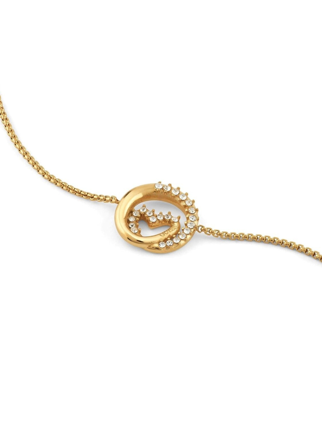 A karkötő különlegessége az integrált kerek medál, amelyet egy hurkolt szív motívum és csillogó kristályok díszítenek. A letisztult dizájn és a ragyogó részletek nőies eleganciát kölcsönöznek a viselőjének, így ideális választás mindennapi viselethez és különleges alkalmakra is.