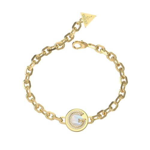 Guess női karkötő elegáns és divatos kiegészítő, amely sárgaarany árnyalatú rozsdamentes acélból készült. A karkötő központi eleme egy kerek medál, amelyen a márka ikonikus G betűje és csillogó cirkónia kövek találhatók, finoman kiemelve a karkötő nőies stílusát.