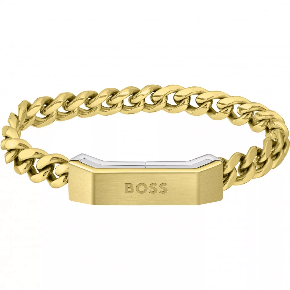 Hugo Boss férfi kakrötő típusa 1580318M. BOSS Jewellery Carter kollekciójának esszenciája, egy láncos nyaklánc és összehangoló karkötő, szemet gyönyörködtető kéttónusú dizájnnal, ideális mindennapi viselethez. A megfordítható, logóval domborított medál szálcsiszolt és recés textúrájú oldalait rozsdamentes acélból és színes IP-ből, míg a karkötőlemez két kontrasztos színű félből áll, amelyek mágneses zárást képeznek.