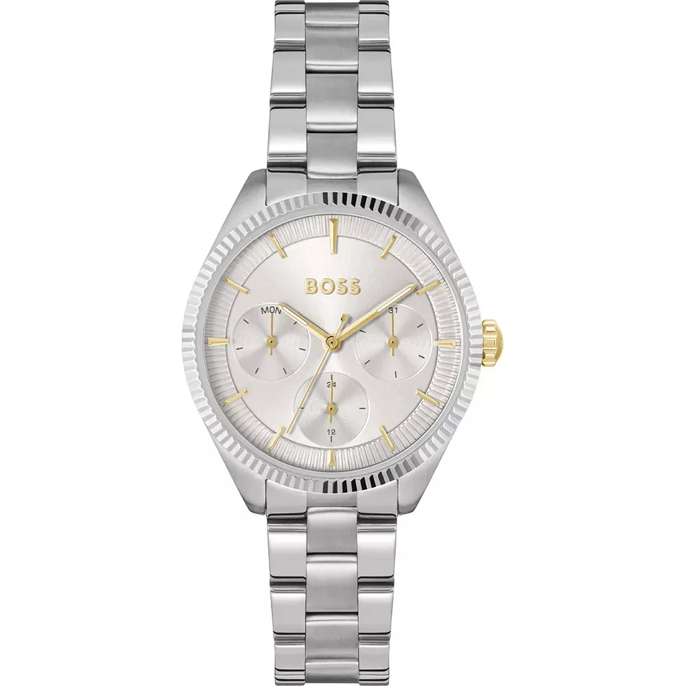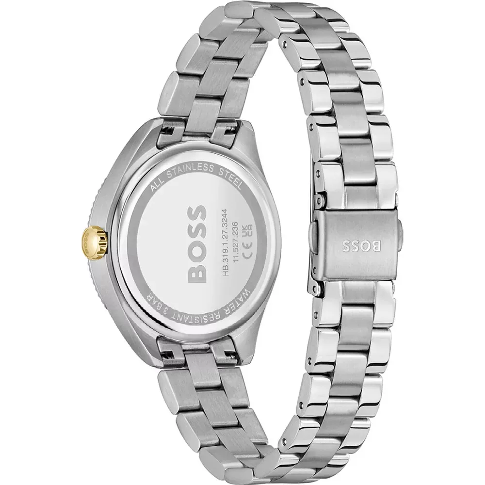 Hugo Boss karórának a tokja ezüst acélból készült, 34 mm átmérőjű, és fém szíjjal van felszerelve. A tok belsejében egy Miyota szerkezet, az órán pedig egy ásványi kristály található.