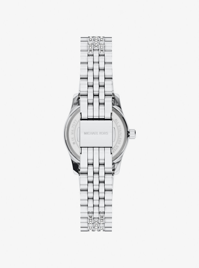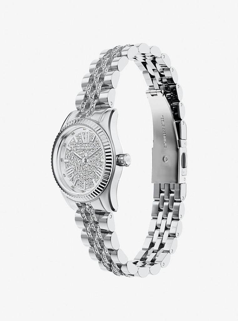 Michael Kors (Lexington Lady) egy kifejezetten ékszer jellegű női karóra, amely az ezüst színt és a kristályos díszítést teljesen maximalizálja. Ez a modell nem visszafogott – ez „csillogós, de még elegáns” kategória.