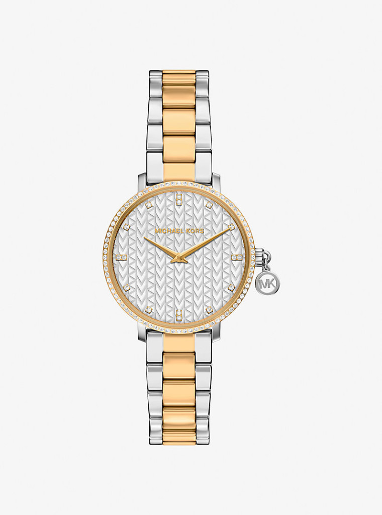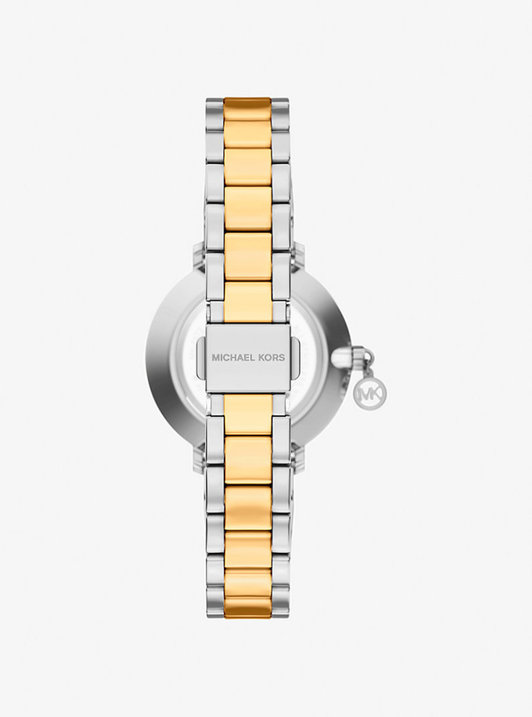 Michael Kors MK7574 (Pyper) egy elegáns, nőies karóra, amely a kéttónusú fémes megjelenést finom, ékszeres részletekkel kombinálja.