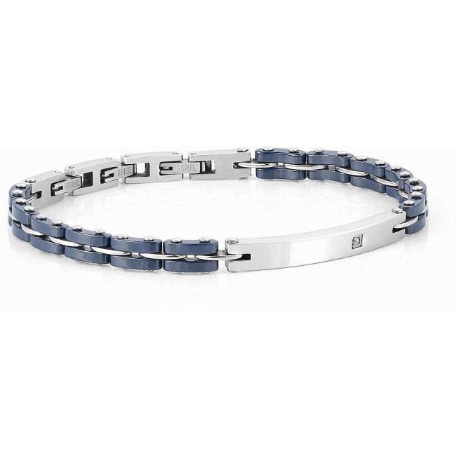 A Nomination Strong férfi karkötő a modern férfi stílusos kiegészítője. Kiváló minőségű, rozsdamentes acélból készült, különleges kék PVD bevonattal, amely tartósságot és egyedi megjelenést biztosít. Középen fehér cubic zirconia kristályok díszítik, így elegáns fényt ad a visszafogott, férfias designhoz.