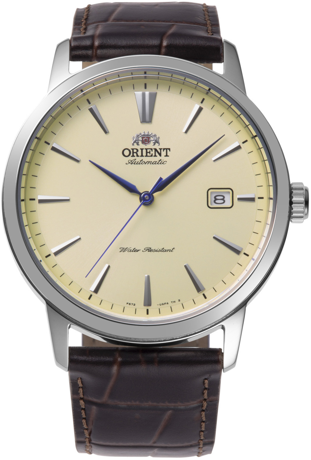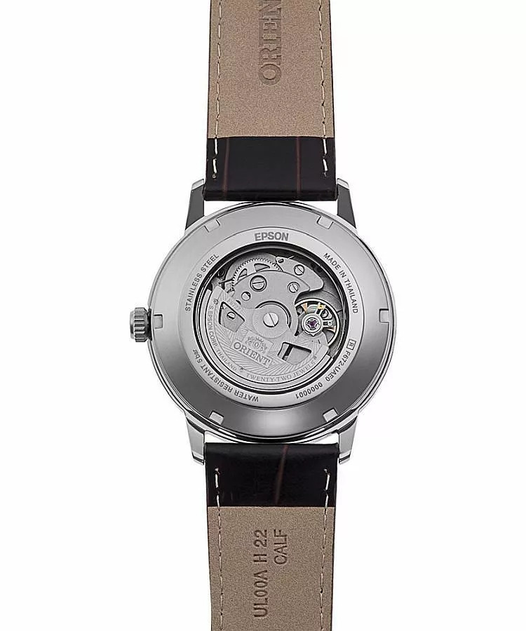 Az Orient Contemporary Automatic férfi karóra RAAC0F16S30B egy kifinomult, klasszikus stílusú automata karóra, amely a mindennapi viselethez és elegáns alkalmakhoz egyaránt ideális. A 41,6 mm-es ezüst tok és a sötétbarna valódi bőr szíj elegáns kombinációt alkot, a homokszínű számlap pedig kifinomult kontrasztot biztosít.