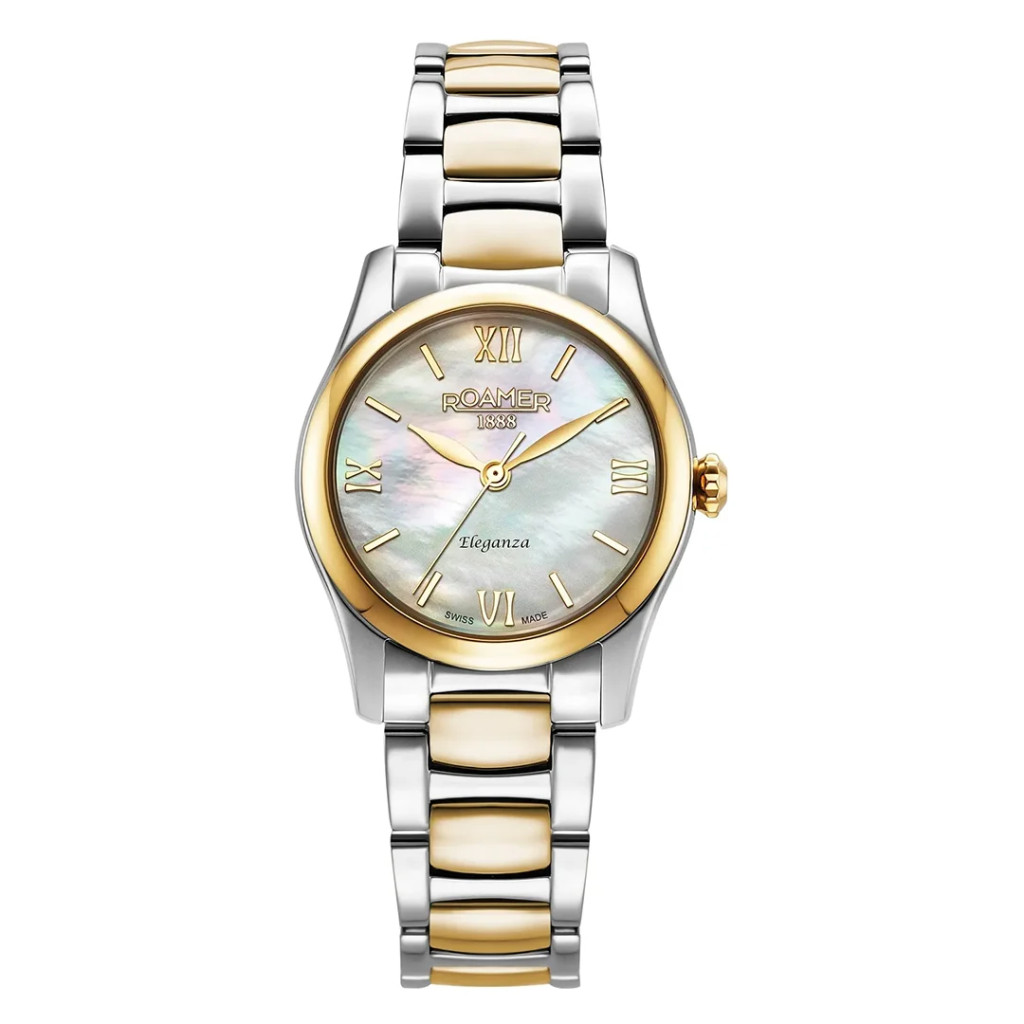 A gyöngyház számlapos elegáns kétszínű, arany és ezüst tokkal és szíjjal készült Roamer Eleganza női karóra kitűnő választás, ha időtálló, különleges és megbízható időmérőt keresünk egy női csuklóra. De ennél jóval többről van itt szó, a bicolor ezüst és arany tok egy precíz, svájci gyártmányú kvarc óraszerkezetet rejt magában, ami nem kívánja a napi törődést és egyszer beállítva hónapokon át mutaja a pontos időt.