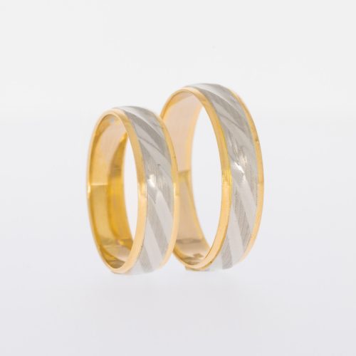 Sárga-fehér arany karikagyűrű 635. 14K-os sárga-fehér arany karikagyűrű. A karikagyűrű belső felülete komfort kialakítású, ami kényelmes érzést biztosít viselőjének.  Felülete fényes. Csodás karikagyűrű egy csodás napra! A jegygyűrű már nagyon régről szimbóluma a férfi és nő között szövetségnek.A férfi két gyűrűt ad a menyasszonynak és egyet vesz magának is, amit a házasságban is viselni fog.