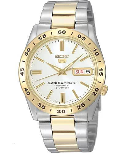 Ez a Seiko 5 SNKE04K1 automata férfi karóra ideális azoknak, akik klasszikus, de feltűnő darabra vágynak. A 37-38 mm átmérőjű két tónusú acél tok és szíj (ezüst és sárga-arany) elegáns kontrasztot ad, míg a tiszta fehér számlap nap- és dátumkijelzéssel praktikus használatot biztosít. A Hardlex kristályüveg védelmet nyújt a karcolásokkal szemben, az óra vastagsága kb. 11-12 mm — nem túl vaskos.