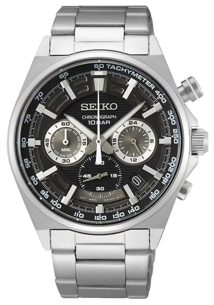 A modellben a japán Seiko 8T63 кварc szerkezet dolgozik, amely stabil, pontos és gondozásmentes választás. A stopper funkció 1/5 másodperces pontossággal mér, a tachymeter skála pedig sportos, dinamikus karaktert ad az órának. A fekete számlapon elhelyezett segédmutatók – stopper percgyűjtő, másodpercmutató és 24 órás kijelző – jól áttekinthetőek és funkcionálisak.