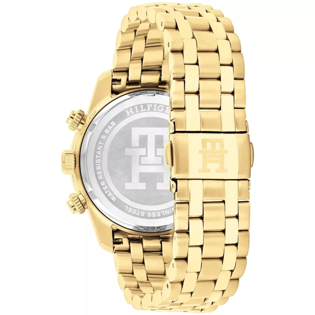 A Tommy Hilfiger 1792158 férfi karóra a sportos elegancia és a funkcionalitás tökéletes kombinációja. A 41 mm-es arany PVD bevonatú rozsdamentes acél tok és a fémszíj prémium megjelenést biztosít, miközben strapabíró és kényelmes viseletet nyújt. A sötétkék számlapon három kék segédszámlap és dátumkijelző található, a fehér fényvisszaverő mutatók és indexek pedig könnyű leolvashatóságot biztosítanak. A kvarc szerkezet megbízható működést biztosít, az ásványi üveg pedig védelmet nyújt a mindennapi használat során. Az óra 50 méteres (5 ATM) vízállósággal rendelkezik, így a mindennapi használat során bátran viselhető. A biztonsági csat zár biztosítja a szoros illeszkedést és a kényelmes viseletet.