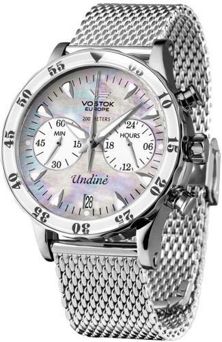 A Vostok Europe Undiné női karóra (515A671-B) egy kifinomult, mégis határozott karakterű időmérő, ami egyszerre hozza a sportos funkciókat és az elegáns, nőies megjelenést. A 39 mm-es nemesacél tok klasszikus arányai kényelmes viseletet biztosítanak, miközben a gyöngyház számlap lágyan csillan minden fényben — ez a kombináció ritka és figyelemfelkeltő.