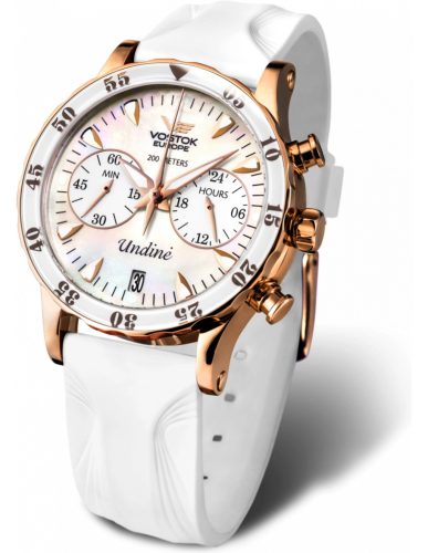 A Vostok Undiné 515B528 a rosegold és a fehér színek kombinációjával készült. Az óra számlapja a kagylóhéj belsejére hasonlító gyöngyházfényt kapott, ezzel kápráztatja el a szemünket. A központi tengelyen az rosegold színű óra és percmutatók, valamint a 12-es indexen pihenő stopper másodperc mutatója található. A jobb oldali segédkör egy napszak kijelző, míg a bal oldali kör a stopper percgyűjtője. Ezt az egészet felülről egy úgynevezett K1 kristály üveg védi, belül tükröződésmentes bevonattal ellátva. Az óra tokja 39 mm átmérőjű rozsdamentes acélból készült, ami egy rosegold színű PVD bevonatot kapott. Ez az ultramagas hőmérsékleten ráégetett festék nem kopik, nem korrodálódik, de ha odaütjük valahova, akkor meg tud karcolódni. Az óraházat egy 60 klikkes acél lünetta koronázza meg, aminek az oldala rosegold színűre lett festve, akárcsak a tok jobb oldalán található gombok és a korona is. A tokfülek közötti távolság 20 mm, ide csatlakozik be az óra fehér színű bőrszíja. A szíj egy ugyancsak rosegold színű acél tüskecsatban végződik. Az utolsó lyukba kapcsolva a maximális belső kerülete 21.5 cm lehet.
