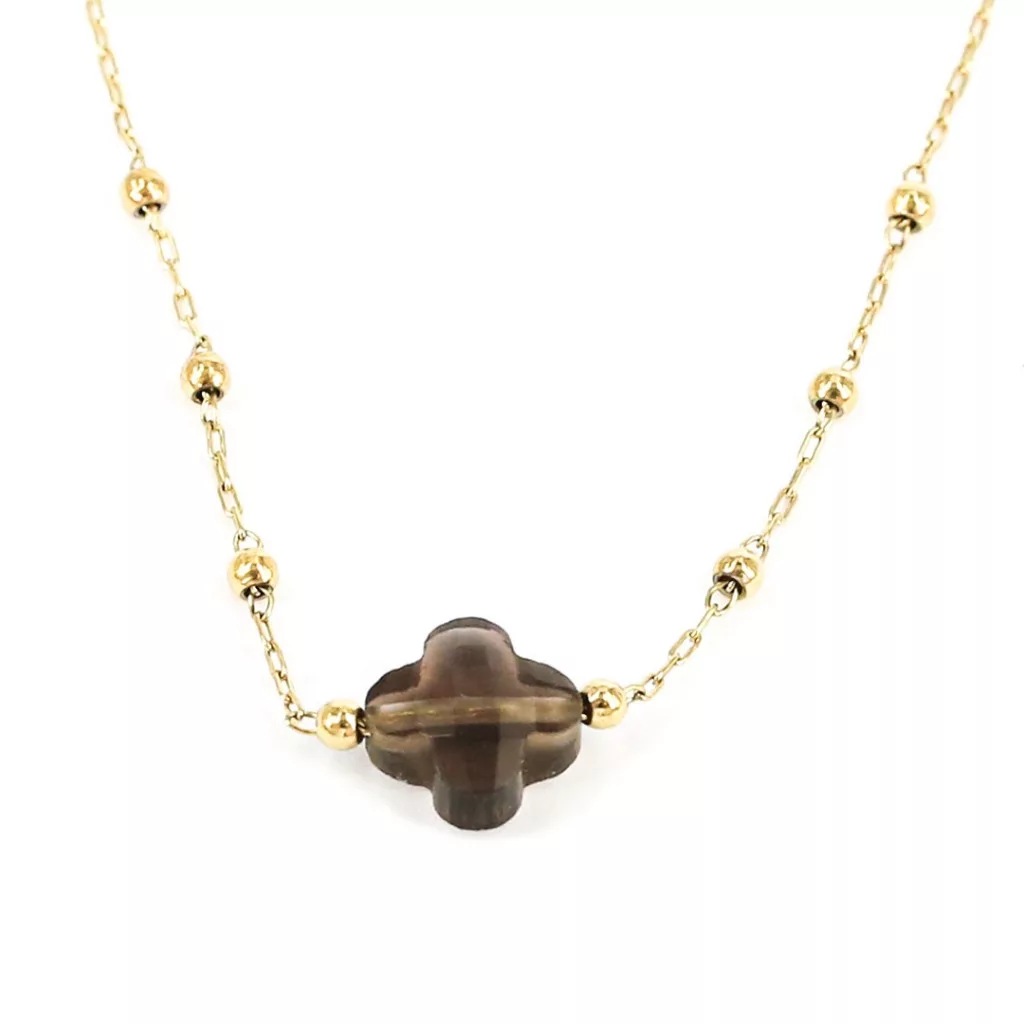 "Rózsafüzér" nyaklánc sima acélból vagy finomarannyal bevont kivitelben, amelyre egy kis lóhere alakú természetes kő van rögzítve. Ezt a pompás nyakláncot kollekciónk más hosszabb nyakláncaival együtt ajánljuk viselni. Hossz: 38 cm és 5 cm-es állíthatóság