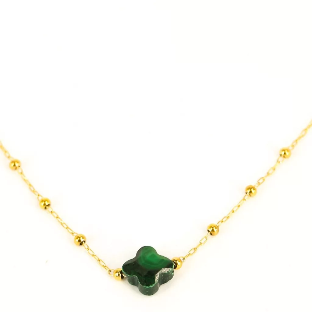 "Rózsafüzér" nyaklánc acélból  finom arannyal bevont kivitelben, amelyre egy kis lóhere alakú természetes kő van rögzítve. Ezt a pompás nyakláncot kollekciónk más hosszabb nyakláncaival együtt ajánljuk viselni.