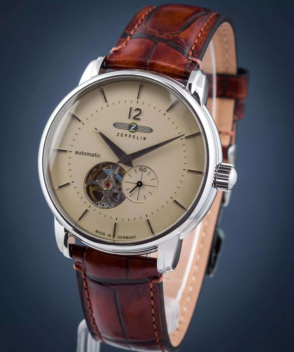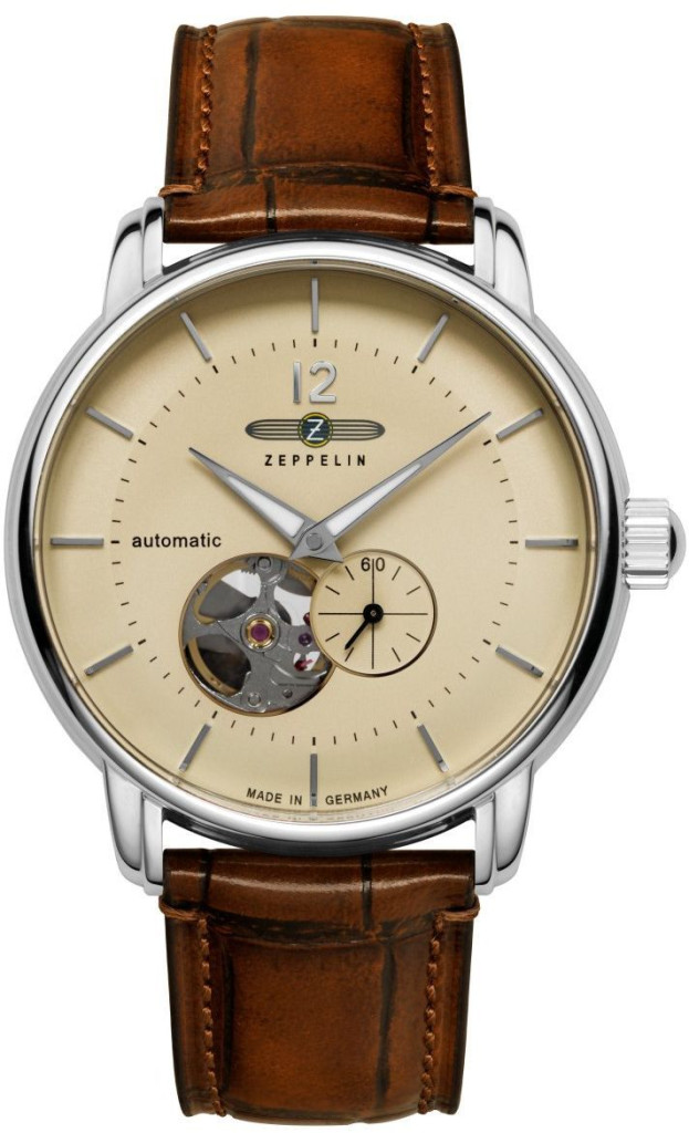 Zeppelin LZ 120 Bodensee férfi karóra 8166-1 automata szerkezettel 2 év magyarországi garanciával. Az óra ezüst színű kör alakú rozsdamentes orvosi acél óratokkal, púder színű számlappal, és edzett ásványüveggel rendelkezik. Az óra vízállósága 5 ATM(kézmosásig vízálló), átmérője 40mm, vastagsága 12mm. Szíja barna színű bőr.